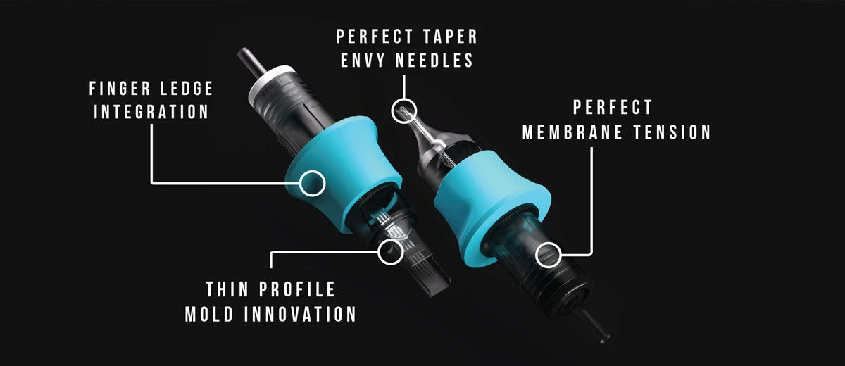 Featuring the same high-end needle quality as the original TATSoul Envy Cartridges, the Envy Gen 2 Cartridges feature an industry-first, cartridge ‘finger ledge’ for maximum comfort, grip and control. This innovative design enables artists to grip the actual cartridge itself while tattooing. Other improvements include a housing redesign which has vastly improved ink flow and blister packaging which double up as cartridge holders. Available in boxes of 10 or 20 and with a wide variety of needle configurations including the usual Liners, Shaders and Mags but also as Hollow Apex Liners, Traditional Curved Mags, Whip Curved Mags and Textured Curved Mags. Each cartridge comes individually blister packaged and EO Gas sterilised. Once opened the cleverly designed blister pack also doubles up as a sturdy disposable cartridge holder. TATSoul Envy Gen 2 cartridges also feature lead-free solder and colour codes enabling easier cartridge identification.