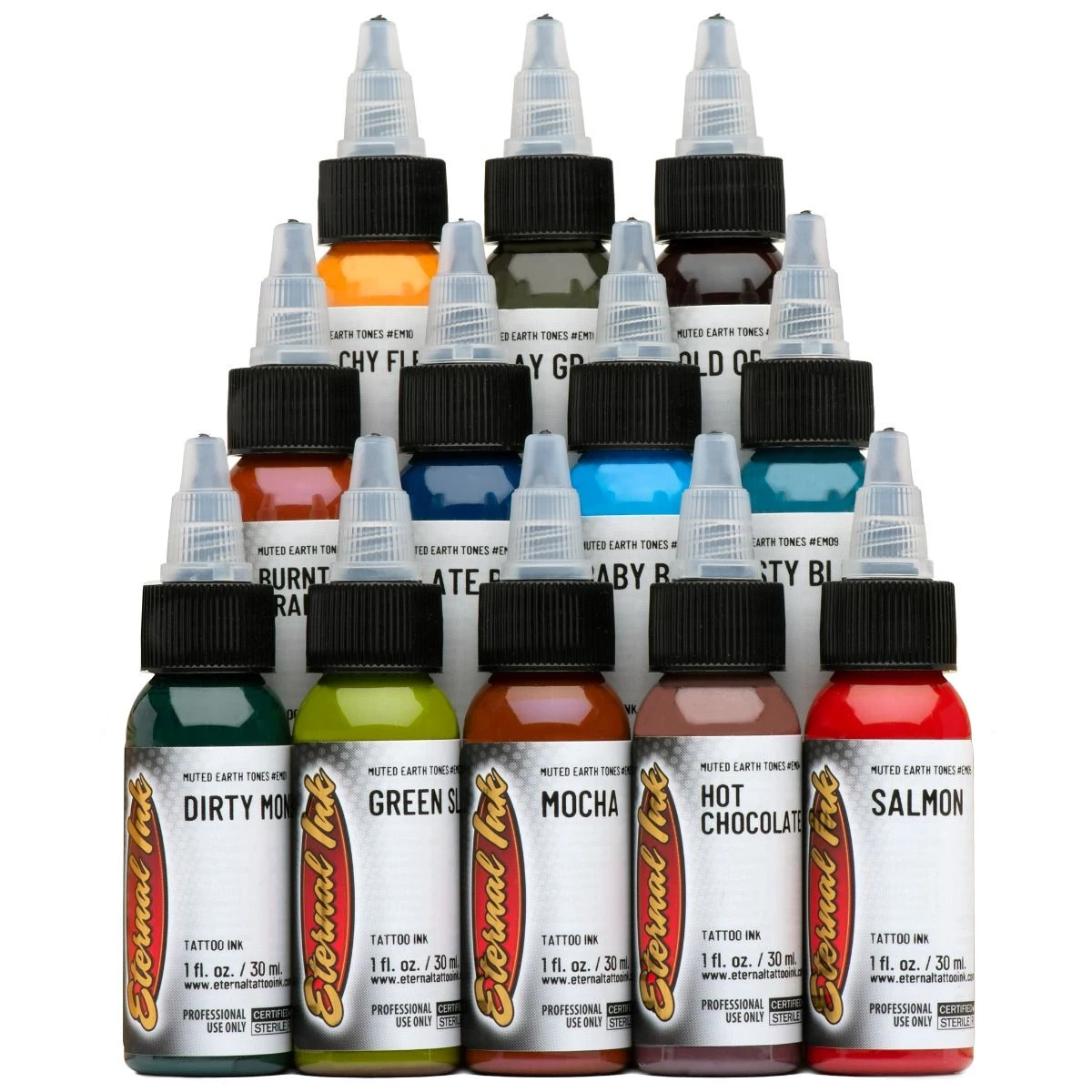 Eternal Ink are extremely proud of their colour range of inks, and are proud to introduce to you the Muted Earth Tone Set. Also known as the “dirty colours”, these inks are made to save you time, as you no longer have to mix inks to get your desired colour. These pre-made colours that are not normally sold in a bottle have been designed with the artist in mind, something that Eternal Ink take very seriously. Included in the set are 12 magnificent earthy colours including Clay Grey, Peach flesh, Burnt Orange, Salmon, Orchid, Mocha, Hot chocolate, Green slime, Dirty Money, Slate blue, Baby Blue and Dusty blue. The Eternal range has been carefully designed and manufactured by the founder of Eternal Tattoos, Terry “Tramp” Welker, an exceptional tattooist himself. He founded the company in 1980 and has had over 30 years’ experience in the tattooing industry. He is an icon to many professionals, and has had many world class artists work for him in one of his 5 shops, including Bob Tyrell, Marshall Bennett and Tom Renshaw. The entire Eternal range is made to the highest quality, treat with gamma ray sterilisation and made to meet European legal requirements. With Eternal Ink you can rest assured that you are using quality ink that is safe for both you and your customer.