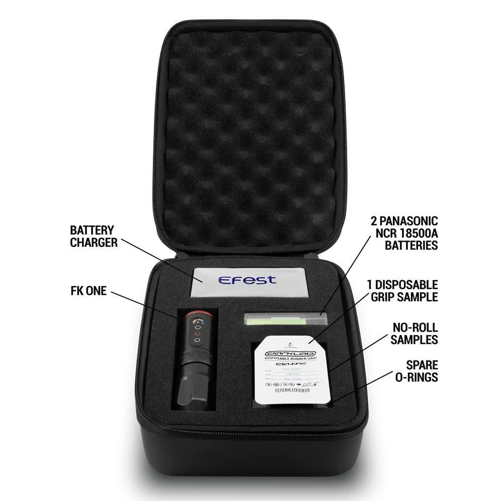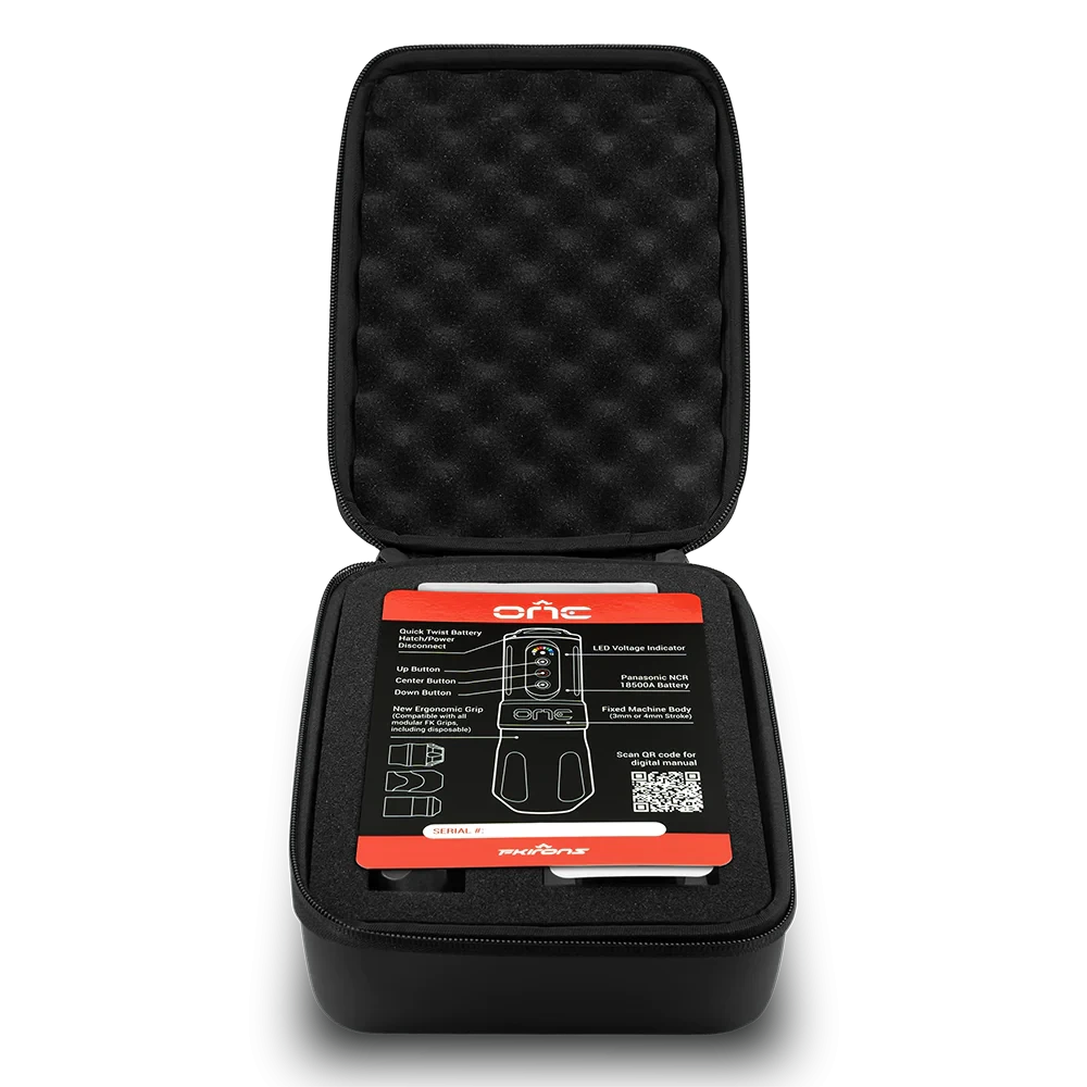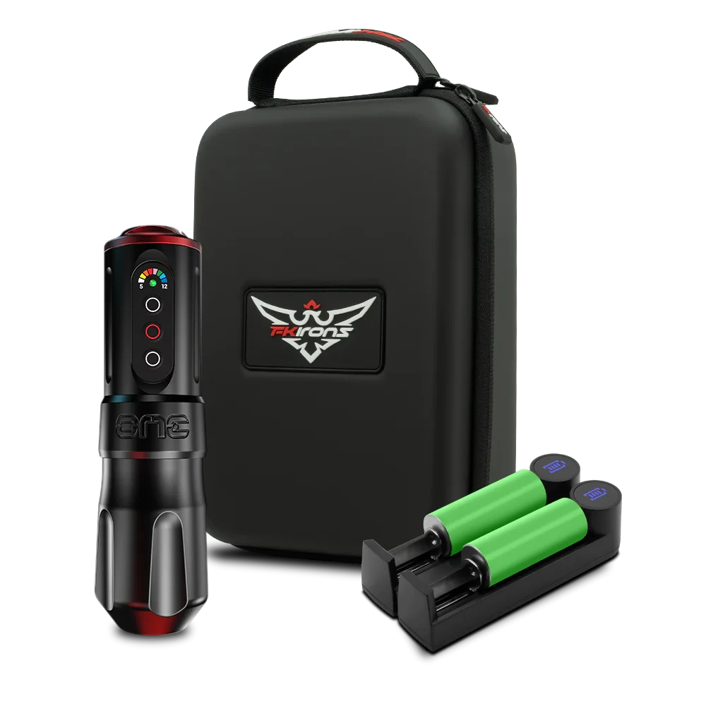 The FK Irons One is a high-end, wireless tattoo machine suitable for all artists. The powerful, replaceable battery provides up to 8 hours of power and has an easy-to-read colour-coded display. The voltage can be controlled in 0.5V increments using the three buttons on the battery, ranging from 5-12V.