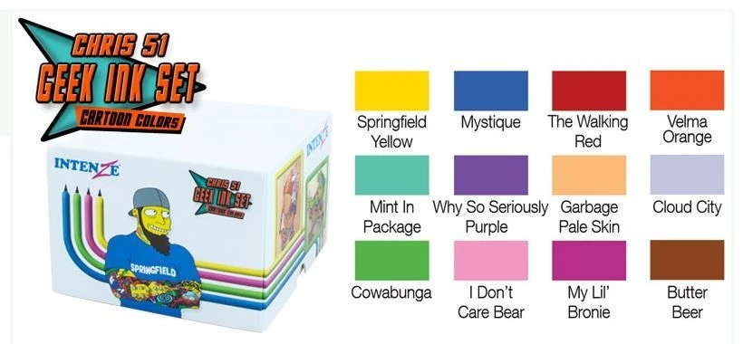 Whether it’s for his hard work or tattoo work, Chris 51 is known as one of the most colorful artists around. When he wanted a different kind of tattoo TV show, he made one! When he wanted to tattoo at comic cons, he made a tour for it! And, when he couldn’t find ink bright enough for his tattoos, he called on Intenze! Together they made the magink happen. With Chris’s vibrant formulas and Intenze’s color-mad scientists, an explosion of Epic Ink was born in his new box set; Chris 51’s Geek Ink. In the set you will find 12 perfectly vivid colors engineered by the Alpha-Geek himself to specifically match your favorite pop-culture subjects. Like your favorite cartoons and movies, the ink will stand the test of time and become as cherished as the iconic characters you are tattooing with it. Known for his technically flawless cartoon tattoos, Chris also explains how he achieves his bright results using this color set through tips, strategies and color-chart layout examples in an 18-page instruction guide included in the box. Chris 51’s Geek Ink Set includes: Springfield Yellow, The Walking Red, Velma Orange, Why So Seriously Purple?, Garbage Pale Skin, I Don’t Care Bear, My Lil’ Bronie, Cloud City, Butter Beer, Mint in Package, Cowabunga (green) & Mystique (blue)