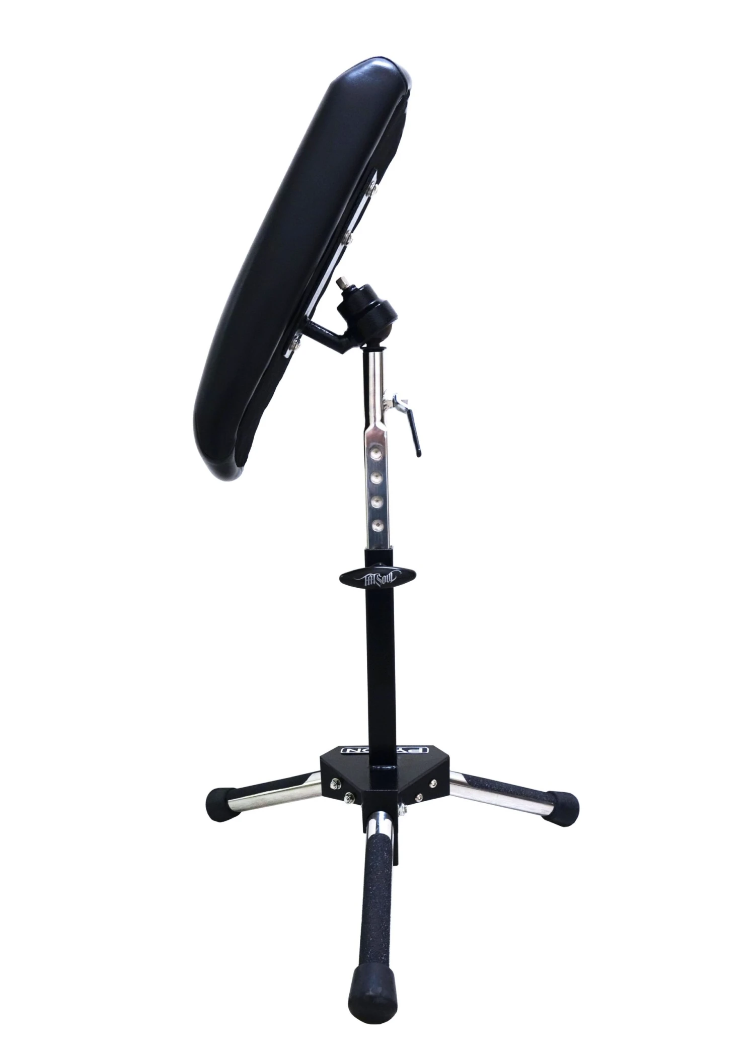 TATSoul Pylon Armrest features a robust steel construction and a ball-mounted rest cushion allowing for easy height and swivel adjustments. The tripod base guarantees a compact, yet stable form and each leg is adorned with grip tape to act as foot rests for the artist. The new patent-pending Hemi-Lock™ Height Adjustment allows the support bar to easily click between settings and lock into place. A practical single lever-tool allows for effortless re-positioning or removal of the cushion for storage and travel. Features: Compact and comes with a duffle bag carrying case 360° ball-mounted rest cushion The new patent-pending Hemi-Lock™ Height Adjustment allows the support bar to easily click between settings and lock into place Tripod base for enhanced stability Steel frame with grip tape foot rests on each leg Easily disassembled for transportation Patent-pending design LIFETIME STRUCTURAL WARRANTY Product Dimensions: Height Range: 24 inches to 36.5 inches Cushion Length: 17 inches Cushion Width: 7 inches Cushion Thickness: 2.5 inches Weight: 14 lbs.